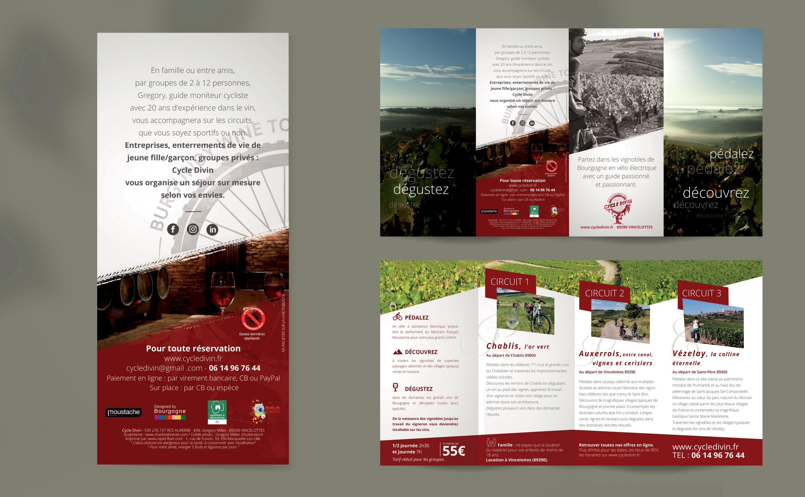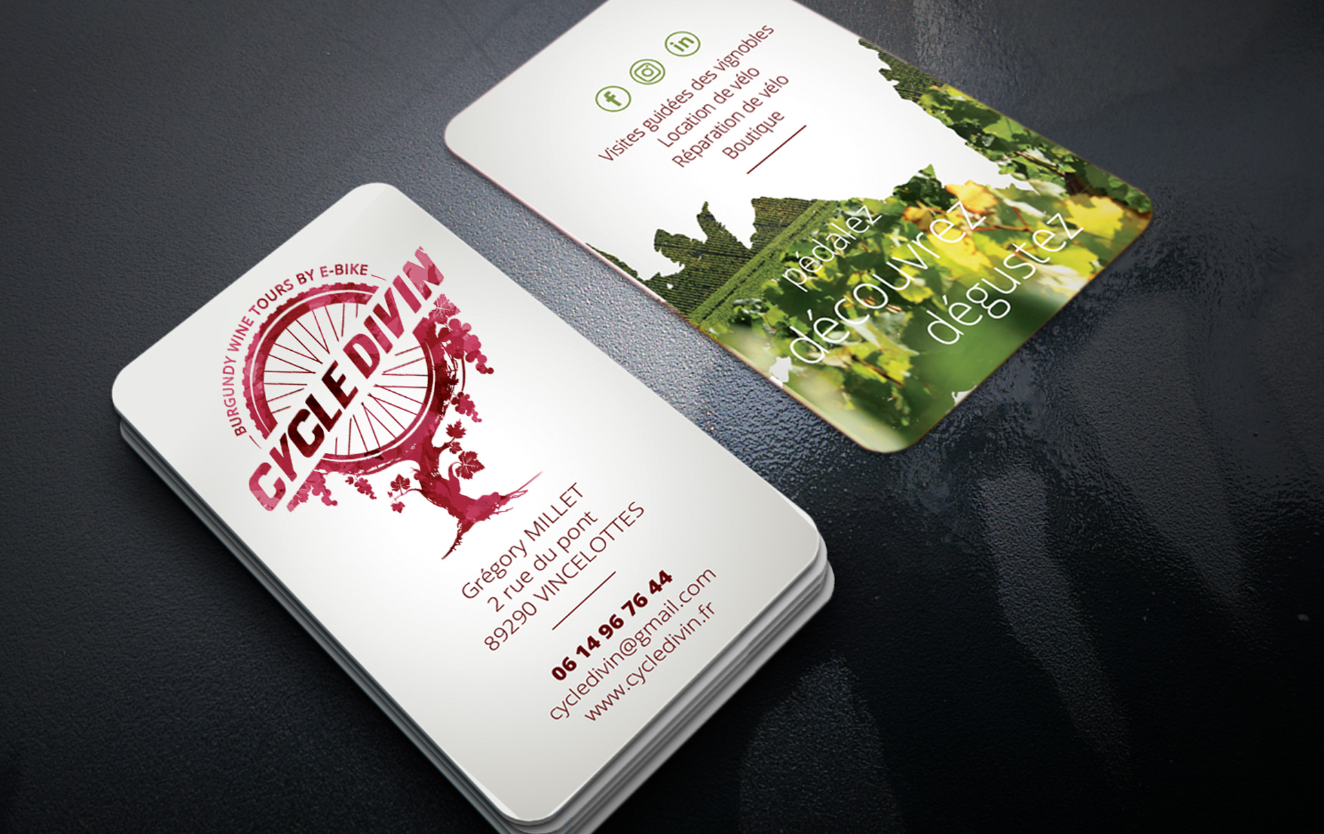 Envie d’une balade en vélo électrique sur-mesure avec un guide passionné et passionnant à travers les vallées viticoles et une dégustation au pied des vignes ? Envie de pédaler dans les célèbres 1ers crus et grands crus du Chablisien? Voici Cycle Divin, une entreprise Bourguignonne, que j’ai eu la chance d’accompagner à travers la création de son logo, plaquette, carte de visite, et autres supports de communication.